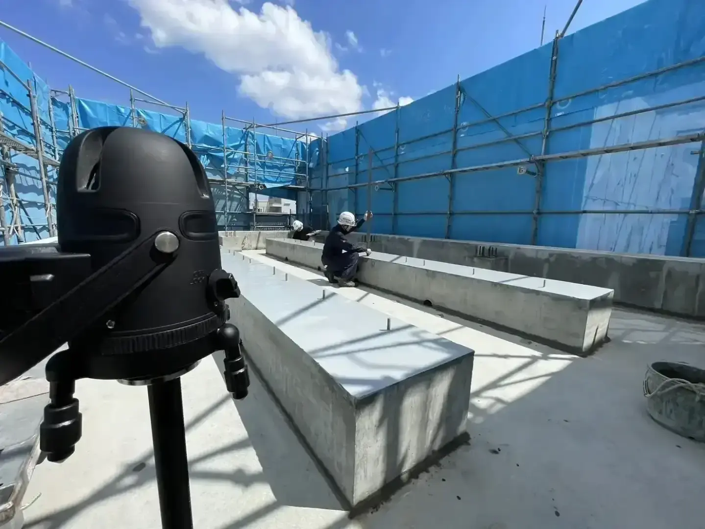 事前に「奥から手前へ」の順序をミリ単位でシミュレーション。門型クレーンを駆使し、水勾配(床の傾斜)に合わせた精密なレベル調整を行いました。