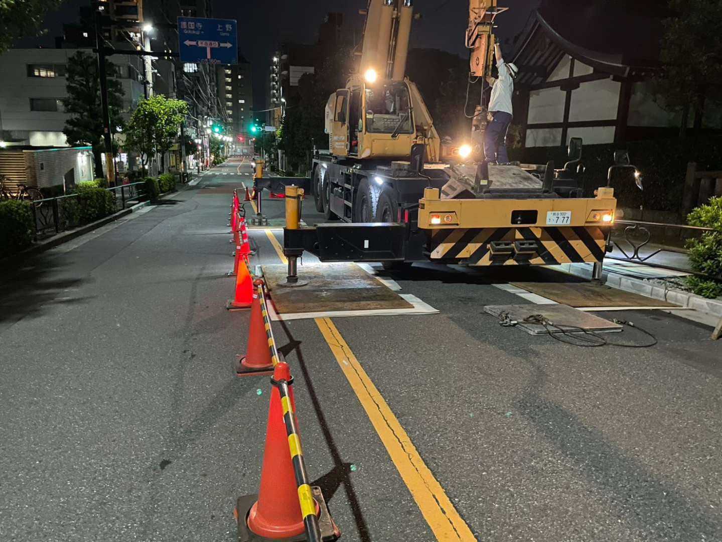 人通りが多い場所のため、クレーン作業は夜間限定となりました。また、事前に水抜きが完了しておらず、工事中に急遽対応する必要が生じました。
