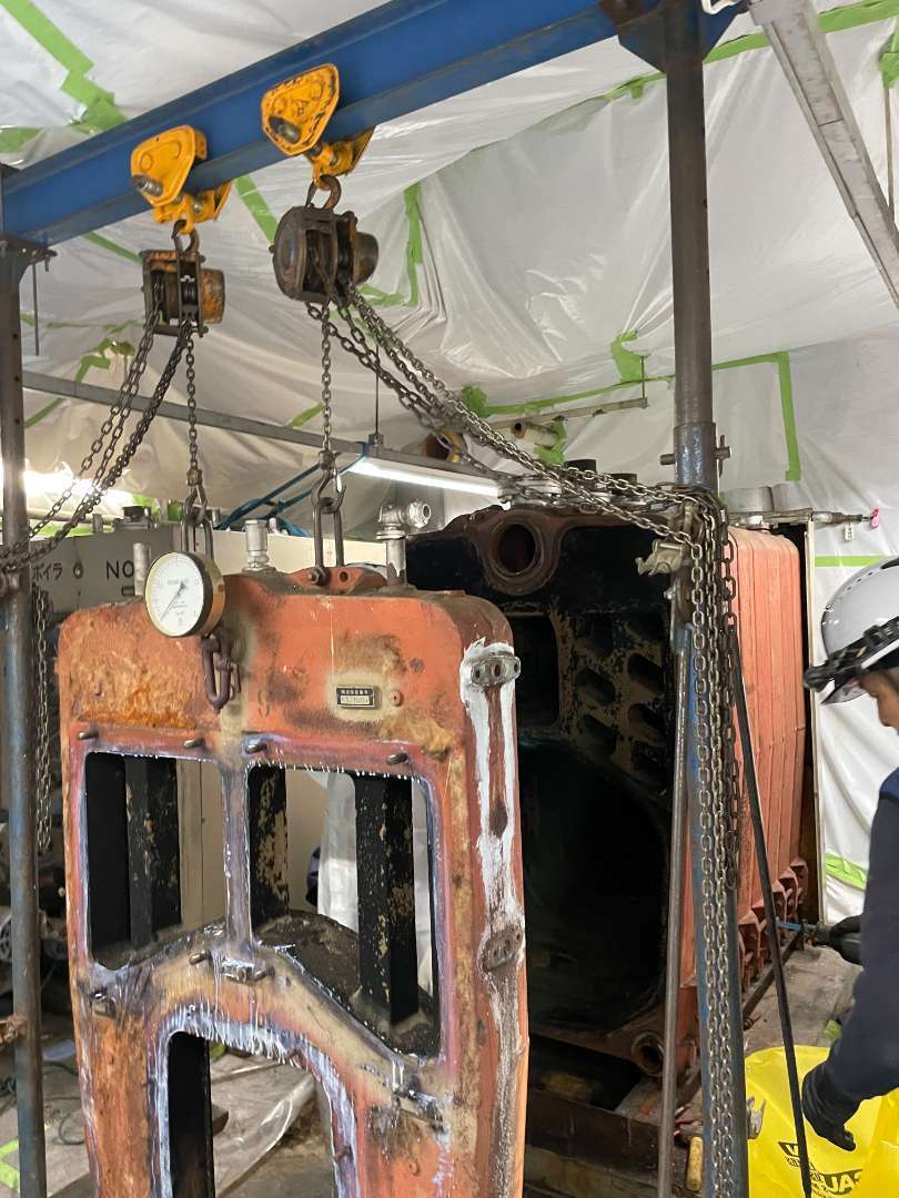 現場での綿密な調査後、門型クレーンを設置。ボイラーのプレートを1枚ずつ慎重に分解し、搬出可能なサイズにしました。アスベストの除去と並行して、安全に配慮しながら部材の搬出作業を進めました。