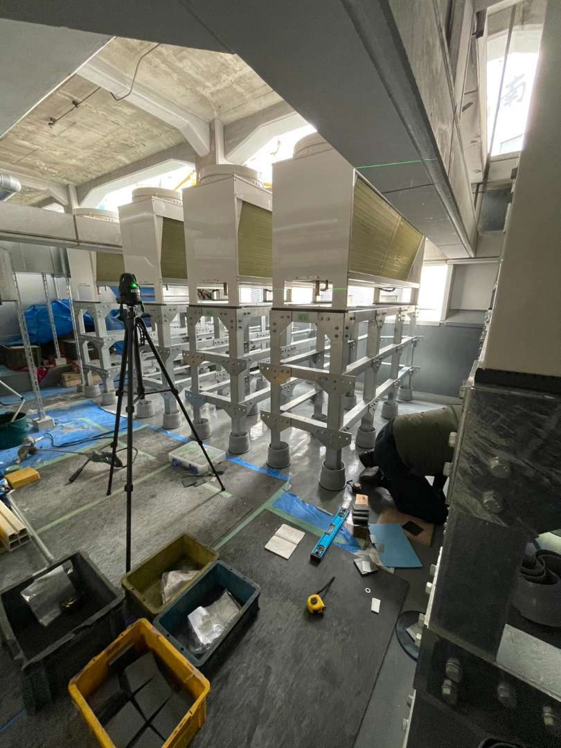 架台の脚部にライナー等を用いて、勾配に合わせてミリ単位で高さを調整。複数の機器が並んだ際にも、全体の天面が美しく揃い、かつ完璧な水平レベルが出るよう、一台一台丁寧に微調整を繰り返しました。