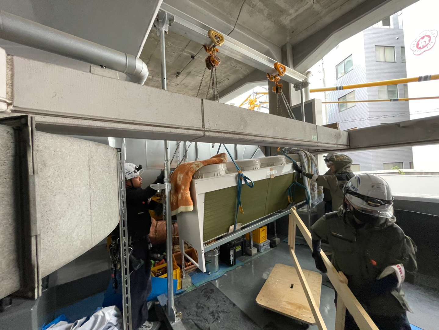 設置場所の床面積が非常に限られており、機器同士の密度が極めて高い現場でした。搬入・据付の順番を一歩間違えると、奥の機器が設置できなくなる、あるいは作業スペースがなくなるといったリスクがありました。