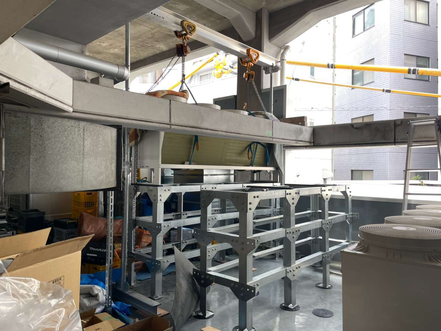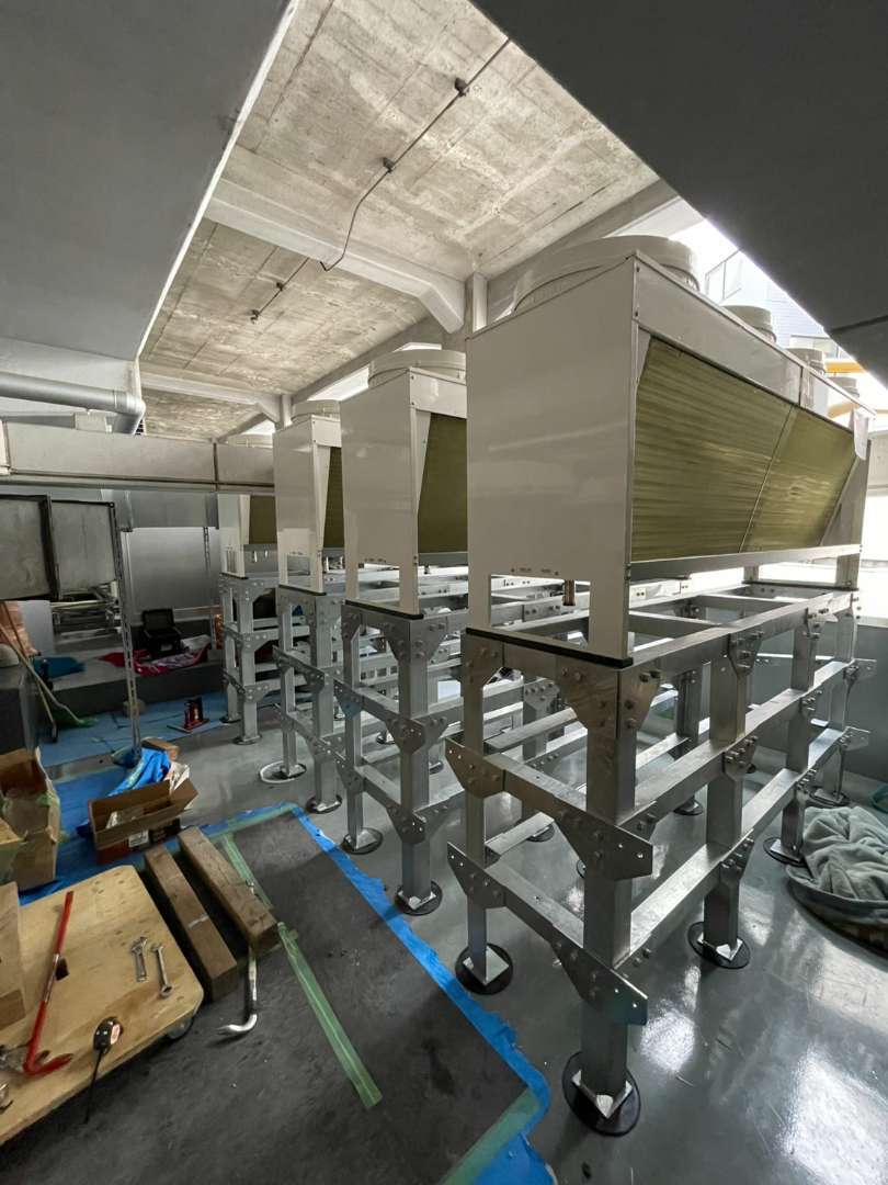 駅ビル内の新店舗オープンに伴い、冷房設備の要となるコンデンサー機器(凝縮器)の架台設置および据付作業を行いました。限られたスペースの中で、複数の機器を効率的に配置する高度な施工が求められました。