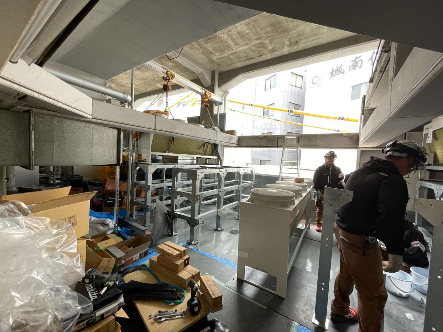 新店舗の空調システムを稼働させるため、専用のコンデンサー設置が必要となりました。商業施設の限られた機械設置スペースを最大限に活用するための施工計画を立案しました。