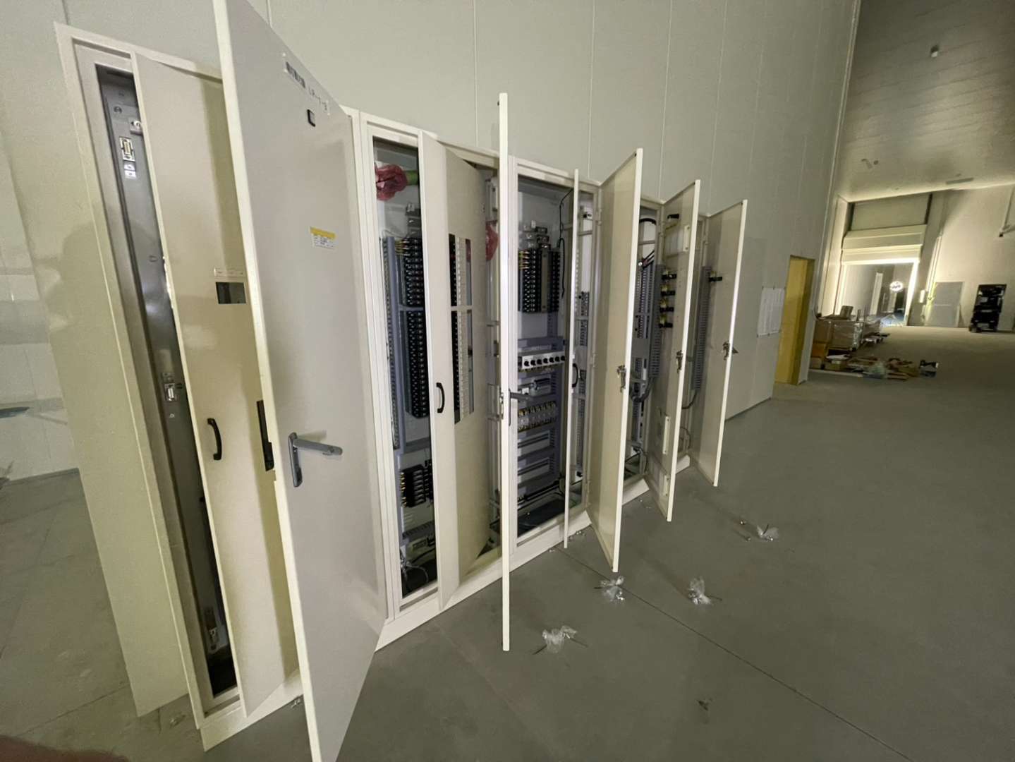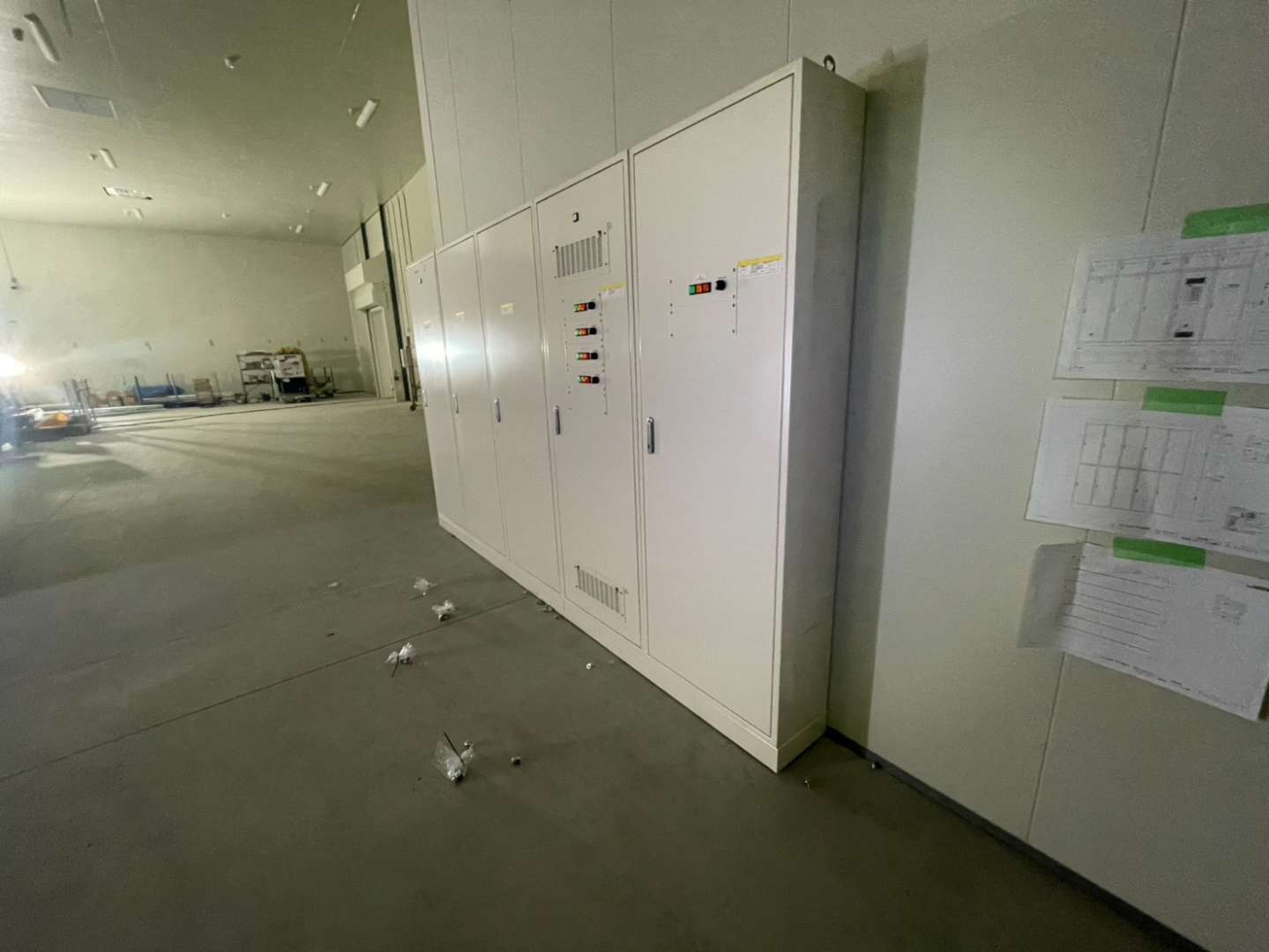 全10面の盤が、「通り」もレベルも狂いなく、整然と並んだ状態で据付完了いたしました。後工程の電気工事業者様がスムーズに配線作業を行えるよう、完璧な基盤を整えることができ、工期通りに作業を終えることができました。