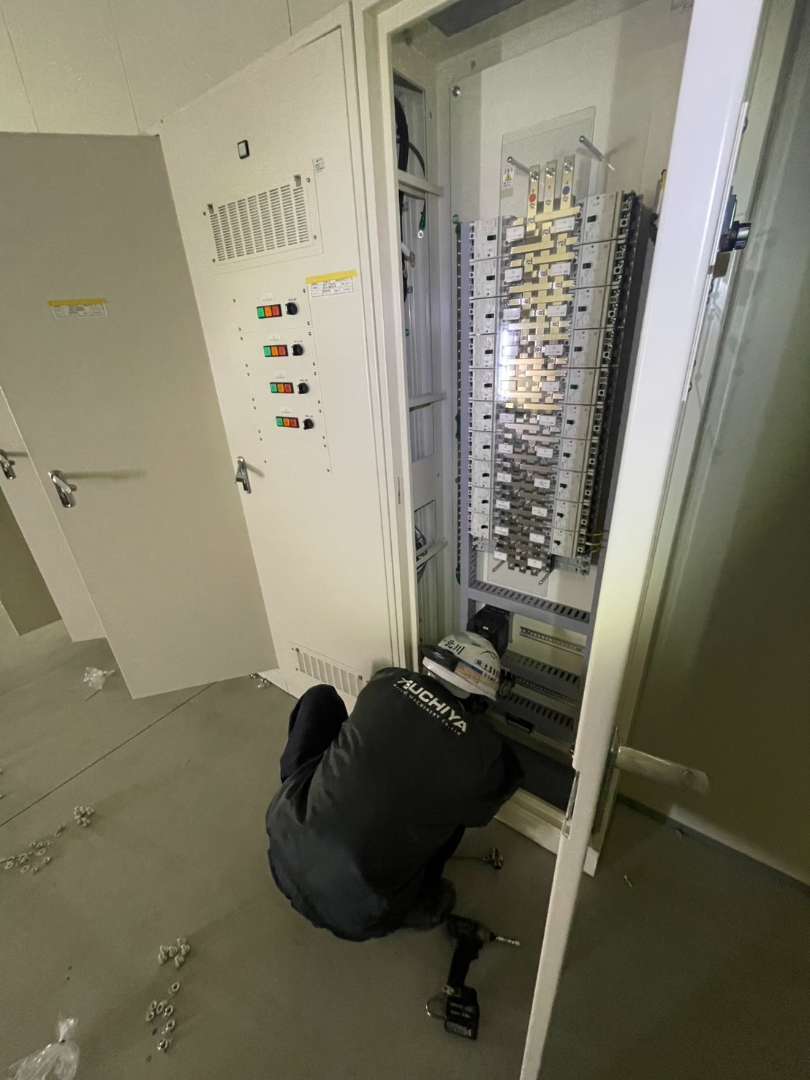 新築の商業施設建設プロジェクトにおいて、受変電設備の核となる電気盤(配電盤・制御盤)合計10面の搬入および据付作業を行いました。