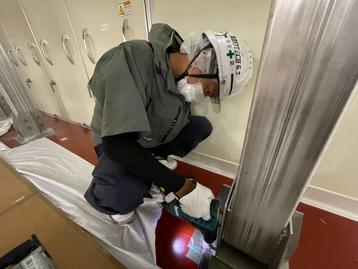 搬入経路および作業エリア全体に、プラスチックボードやゴムマット等を用いて重厚な養生を施しました。さらに、使用する機材の清掃・養生を徹底し、クリーンな環境を維持したまま作業を進めました。