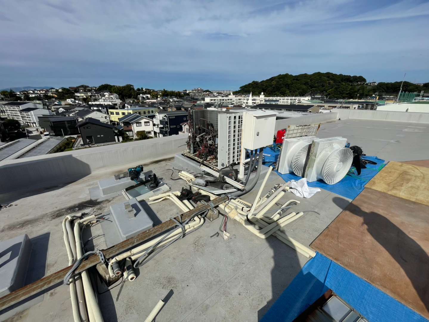 校舎の老朽化に伴う空調設備の更新にあたり、屋上に設置された古い室外機の撤去作業を行いました。